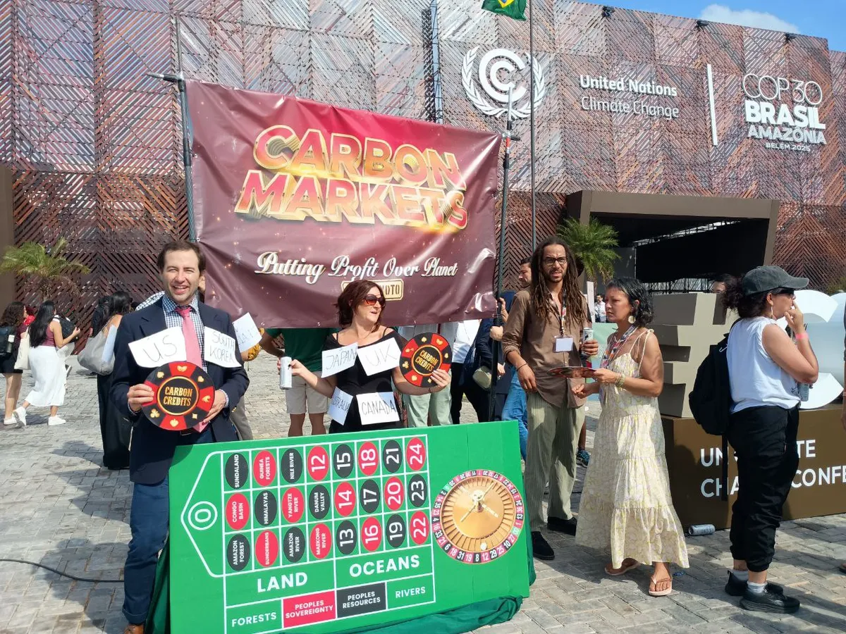 Do lado de fora, manifestantes fazem protesto contra o mercado de carbono e denunciam a financeirização da natureza - Foto: Micael Olegário / #Colabora