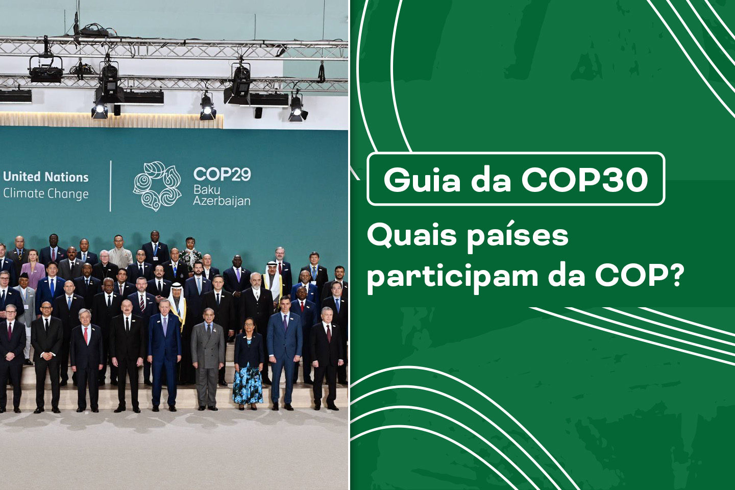 A COP30 é a 30ª edição da Conferência das Nações Unidas sobre Mudanças Climáticas, realizada para debater soluções contra a crise climática. O evento acontece entre 10 e 21 de novembro de 2025 em Belém, no Pará, reunindo representantes de todo o mundo. Participam 198 países signatários da Convenção-Quadro das Nações Unidas sobre a Mudança do Clima (UNFCCC), como Alemanha, Japão, China, Estados Unidos e muitos outros — a lista completa está disponível no site da UNFCCC.