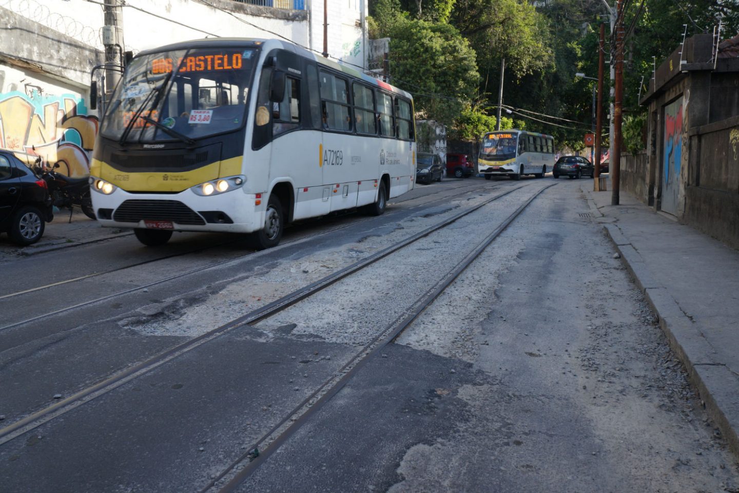 Dos 10,5 quilômetros de trilhos prometidos, foram entregues apenas 3 mil metros. E há mais de dois meses as obras de expansão estão paradas. Foram interrompidas pela Secretaria estadual de Transportes, para desânimo maior dos moradores, de um dia para o outro. Quem passa hoje na Rua Almirante Alexandrino, a principal do bairro, se espanta com o estado da pista no trecho entre o Hospital Quarto Centenário e o Morro do Fallet. São cerca de 350 metros em que a rua ficou sem capeamento em uma de suas duas faixas, o que fez o trilho se destacar no meio da terra e da brita que cobrem o chão esburacado, deixando motoristas e ciclistas em risco.