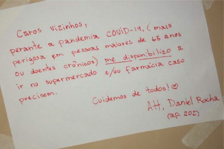 Além dessas iniciativas, temos também as pessoas que se disponibilizam para ir à rua no lugar de idosos. A ação acabou gerando, em muitos casos, o primeiro contato entre vizinhos. “Vi em um grupo do Facebook de moradores da Gávea, no Rio, uma senhora se disponibilizando para ajudar no que fosse preciso. Achei a ideia sensacional e na hora assinei embaixo. Acontece que nem todos têm acesso ao Facebook, ainda mais os que estão no grupo de risco”, explica o estudante Daniel Rocha, de 23 anos, que resolveu colar mensagens nos elevadores de seu prédio e distribuir pelas ruas do bairro, oferecendo ajuda. “É a obrigação dos jovens”, acredita.