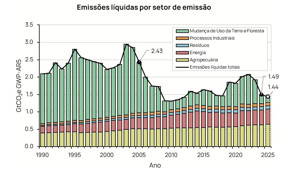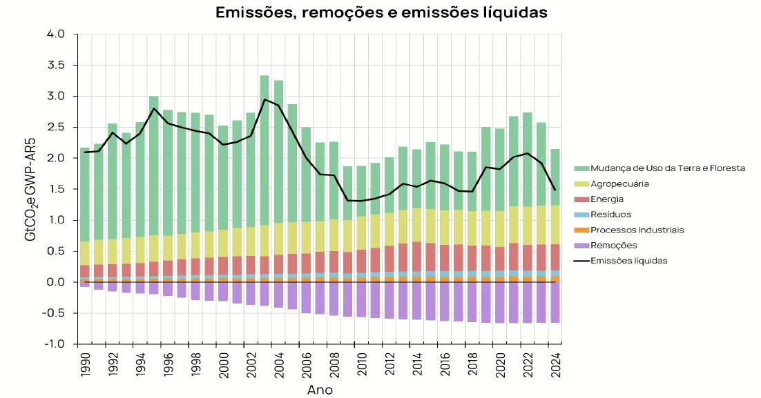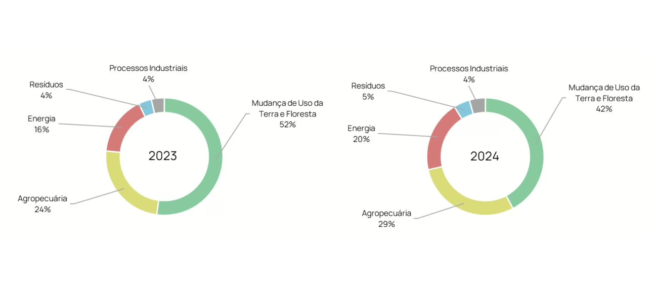Descontadas as remoções por áreas protegidas e florestas secundárias, as emissões líquidas por mudança de uso da terra tiveram uma queda brutal: 64%, a maior redução da história. Elas caíram de 685 milhões para 249 milhões de toneladas de CO2 equivalente em 2024 em relação a 2023. Por conta dessa redução, o setor de mudança de uso da terra deixou de ser a principal fonte de emissões líquidas do Brasil, caindo de 35% para 17% do total. Agropecuária (de 33% para 42%) se torna a maior. Energia sobe de 22% para 29%, e processos industriais e resíduos sobem ambos de 5% para 6%.