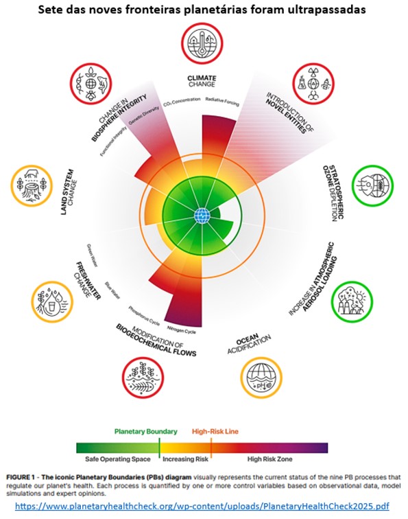 Em 2025, o Laboratório de Ciências de Fronteiras Planetárias (PIK, 2025) indica que sete das nove fronteiras críticas do sistema terrestre foram ultrapassadas, deixando apenas a depleção da camada de ozônio e a carga de aerossóis dentro dos limites seguros.