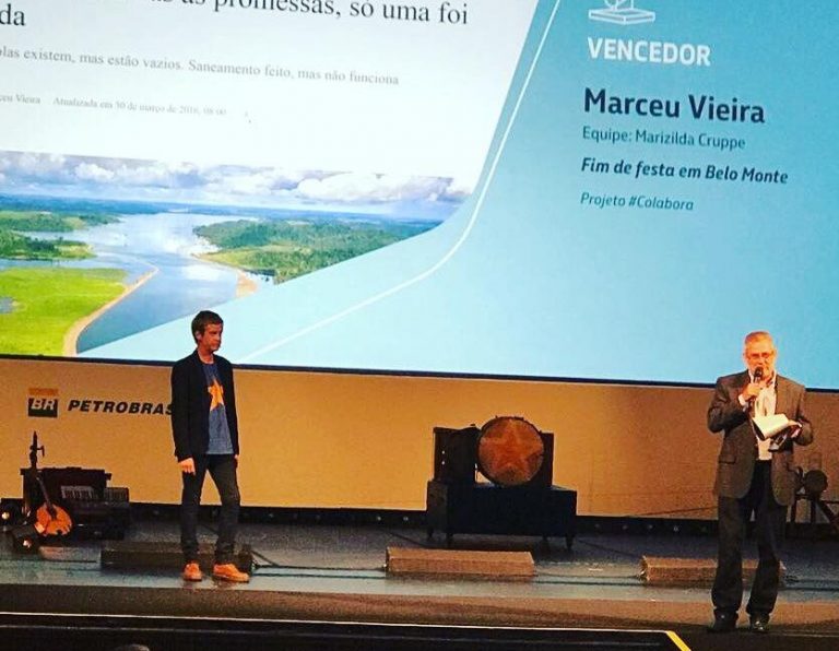 Antes de completar dois anos de vida, o Projeto #Colabora ganha um referendo de excelência jornalística. A série de reportagens “Fim de festa em Belo Monte”, de Marceu Vieira e Marizilda Cruppe, conquistou, na noite desta segunda-feira, o Prêmio Petrobras de Jornalismo, na categoria Sustentabilidade. Agostinho Vieira, editor do #Colabora, subiu ao palco do Theatro Municipal para receber o troféu pela dupla, e destacou, em seu discurso, a importância do jornalismo independente. Aliás, este foi um dos destaques da noite: dos 33 trabalhos finalistas, 7 eram de veículos sem ligação com grandes grupos de comunicação, como a Agência Pública, o Vice, o Puntero Izquierdo e a Revista Amazônia Viva. O prêmio principal, no entanto, ficou com André Borges e Leonencio Nossa, do jornal O Estado de S.Paulo, pela reportagem “Terra Bruta – pistolagem, devastação e morte no coração do Brasil”. Conheça os vencedores: