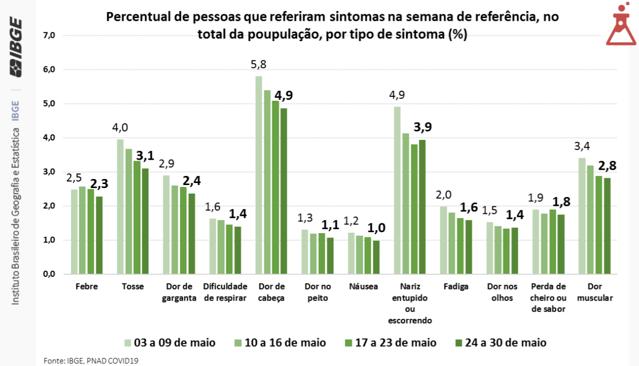 A população brasileira em 2020 está em torno de 211 milhões de habitantes. Portanto, o número de casos da covid-19 (1 milhão de infectados) representa apenas 0,5% da população nacional. Mas, segundo o IBGE, 10,5% dos habitantes do país, um contingente de 22,1 milhões de indivíduos, apresentaram pelo menos um dos 12 sintomas associados à síndrome gripal (febre, tosse, dor de garganta, dificuldade para respirar, dor de cabeça, dor no peito, náusea, nariz entupido ou escorrendo, fadiga, dor nos olhos, perda de olfato ou paladar e dor muscular).