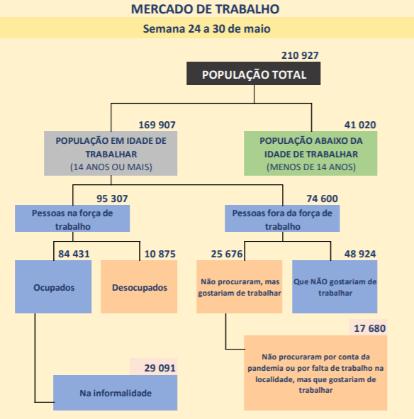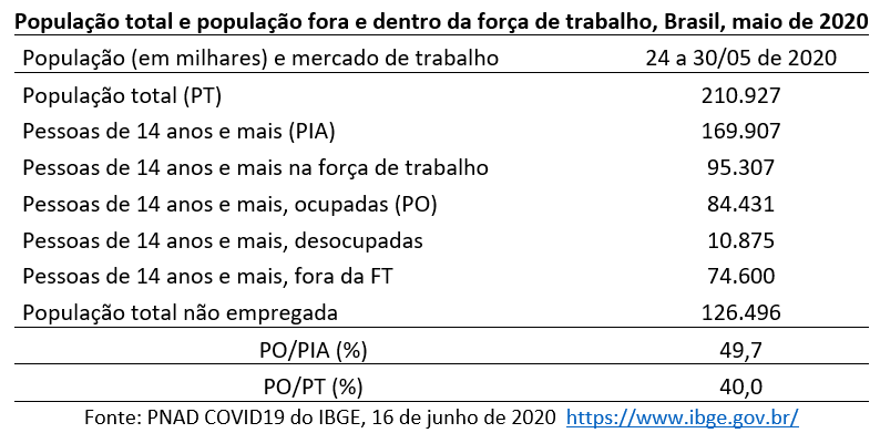 A pesquisa PNAD COVID19 do IBGE, divulgada em 16/06/2020, estimou a população total brasileira em 210,9 milhões de habitantes, sendo 169,9 milhões a população composta de pessoas de 14 anos ou mais, considerada população em idade de trabalhar (PIA).