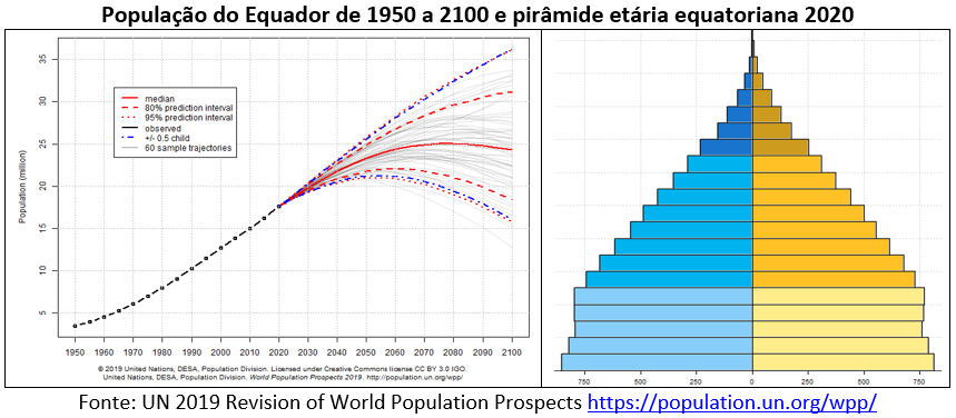 As mulheres equatorianas tinham em média 6,8 filhos no quinquênio 1950-55, acima da média da América Latina e Caribe (ALC), mas a fecundidade caiu, embora o valor de 2,4 filhos, no quinquênio 2015-20, continue acima da média da região. Os indicadores de mortalidade infantil e de esperança de vida ao nascer estavam abaixo da média da ALC em meados do século passado e agora estão ligeiramente melhor do que o resto do continente. O Índice de Envelhecimento (IE) era de 20 idosos (60 anos e mais) para cada 100 jovens de 0 a 14 anos e está em 40 idosos por 100 jovens atualmente. Em consequência, o Equador possui uma estrutura etária rejuvenescida, o que propiciaria melhores condições para reduzir a letalidade da pandemia.