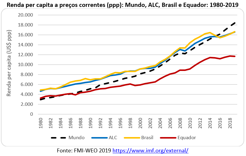 Em 1980, o Equador tinha uma renda per capita pouco acima da média mundial, mas cerca de 70% da renda da América Latina e do Brasil. Nos últimos 40 anos a renda do Equador seguiu, aproximadamente, o mesmo ritmo da região, mas ficou muito abaixo da média mundial. Conforme mostra o gráfico abaixo, com base nos dados do FMI, a preços correntes, em poder de paridade de compra (ppp na sigla em inglês), o Equador tinha, em 2019, uma renda de US$ 11,7 mil, enquanto o Brasil e a ALC tinham renda de cerca de US$ 16,6 mil e a média mundial de US$ 18,4 mil.