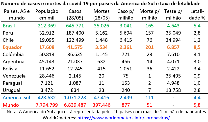 A América do Sul tem se consolidado como o novo epicentro da pandemia do coronavírus. Na América do Sul, o Brasil é o país que apresenta o maior número de casos e mortes, mas o Equador é o país que apresenta o maior coeficiente da mortalidade. O Brasil tem 2,7% da população mundial, mas tem 9,4% dos casos e 8,8% dos óbitos globais. A América do Sul tem 5,5% da população mundial, mas tem 15,7% dos casos e 11,9% dos óbitos. O Equador que tem 0,23% da população mundial, tem 0,6% dos casos e 0,9% dos óbitos globais, conforme a tabela.