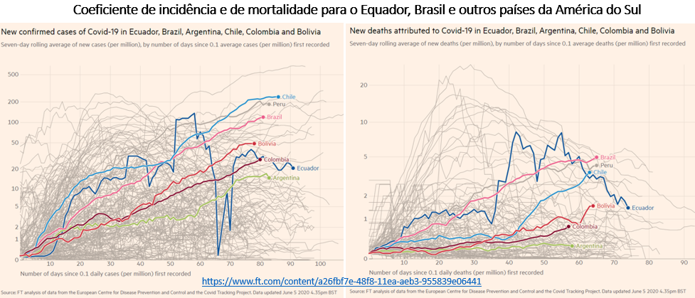 Os gráficos abaixo, com base em material do jornal Financial Times que apresenta a série de dados dos países para o número de casos e de mortes, a partir da média móvel de sete dias (uma semana) dos novos casos e novas mortes, por número de dias desde que foram alcançadas, em média, três mortes pela primeira vez. O gráfico da esquerda apresenta o coeficiente de incidência e o gráfico da direita apresenta o coeficiente de mortalidade. Em ambos, o Equador se destacava nos dois primeiros meses, mas conseguiu reduzir os impactos diários no mês de maio e início de junho.