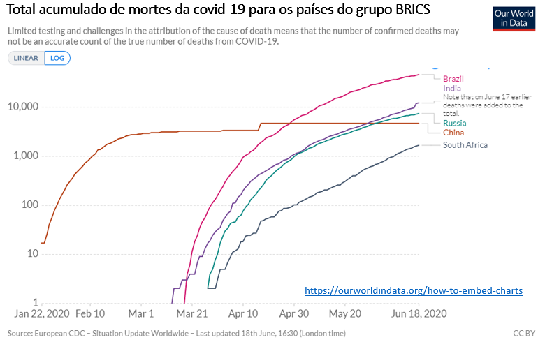 O Brasil é o país mais afetado pela pandemia do novo coronavírus e, por incrível que pareça, a China, que foi o epicentro original da covid-19, atualmente, é o país menos afetado entre aqueles que fazem parte do grupo do BRICS (Brasil, Rússia, Índia, China e África do Sul). No dia 18 de junho a África do Sul ultrapassou a China em número de casos.
