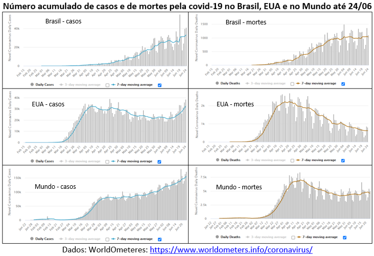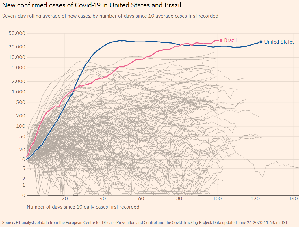 O gráfico abaixo, do jornal Financial Times, apresenta a média móvel de 7 dias do número diário de casos, mostrando que nas últimas semanas o Brasil ultrapassou os EUA e assumiu a liderança global. Contudo, os EUA que pareciam ter ultrapassado o pico e iniciado a fase de declínio da curva, apresentaram um repique e a curva voltou a subir, embora as variações diárias americanas continuem abaixo das variações brasileiras. No dia 24/06 o Brasil teve 42.725 novos casos e os EUA tiveram 38.386 novos casos.