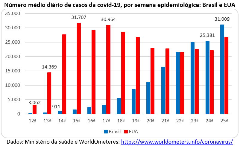 O gráfico abaixo mostra o número médio diário de casos, por semana epidemiológica (SE), nos EUA e no Brasil. Na 12ª SE (de 15 a 21 de março), os EUA tiveram 3.062 casos diários, enquanto o Brasil teve apenas 144 casos. Na 15ª SE (05-11/04) os EUA bateram o recorde de 31.707 casos diários, enquanto o Brasil teve apenas 1,5 mil casos diários. Na 22ª SE (24-30/05) houve empate e na 23ª SE o Brasil com 25 mil casos superou os 22,5 mil casos dos EUA. A diferença se ampliou na 24ª SE (07-13/06) quando o Brasil teve 25.381 casos diários na média semanal, enquanto os EUA tiveram 22 mil casos diários. Na 25ª SE (14-20/06) o Brasil bateu o recorde de casos diários, com a média de 31 mil, enquanto os EUA, mesmo abaixo do Brasil, aumentaram para 27 mil.