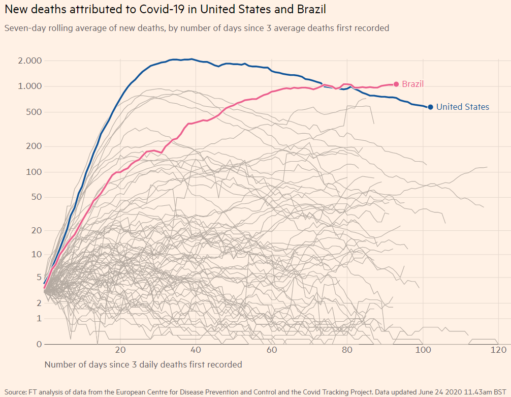 O gráfico abaixo, igualmente do jornal Financial Times, apresenta as variações do número diário de mortes, mostrando que nas últimas semanas o Brasil também ultrapassou os EUA, assumindo a liderança global. No número diário de óbitos, os EUA claramente já ultrapassaram o pico e estão apresentando variações cada vez menores no dia a dia. Ontem, 24/06, o Brasil teve 1.185 mortes em 24 horas, enquanto os EUA tiveram 808 óbitos em 24 horas.