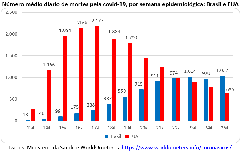 O gráfico abaixo mostra o número médio diário de mortes, por semana epidemiológica (SE), nos EUA e no Brasil. A primeira morte no Brasil aconteceu em 17 de março. Na 13ª SE (de 22 a 28 de março), os EUA tiveram 1.919 mortes diárias, enquanto o Brasil teve apenas 13 mortes. Na 17ª SE (19-25/04) os EUA bateram o recorde de 2.177 mortes diárias, enquanto o Brasil teve apenas 175 mortes diárias. Na 22ª SE (24-30/05) houve empate e na 23ª SE o Brasil com 1.014 mortes superou os EUA que tiveram 900 mortes diárias. Na 24ª SE o Brasil apresentou redução do número diário para 970 mortes, contudo a diferença aumentou pois os EUA tiveram uma queda para 776 mortes diárias em média. Na 25ª SE (14-20/06) a diferença voltou a aumentar, pois o Brasil bateu o recorde de 1.037 mortes diárias, enquanto os EUA tiveram 636 mortes.