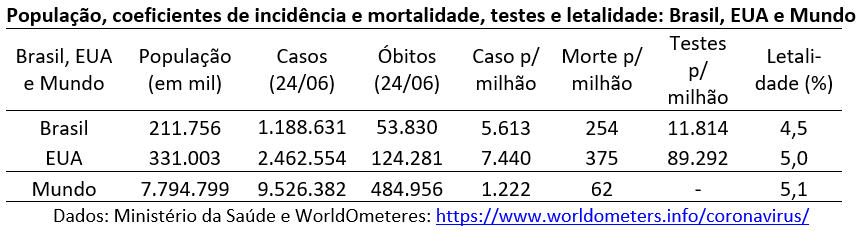 A tabela abaixo mostra que o Brasil apresentou, no dia 24/06, um coeficiente de incidência de 5.613 casos por 1 milhão de habitantes, contra 7.440 casos por milhão dos EUA e 1.222 da média mundial. O coeficiente de mortalidade foi de 254 mortes por milhão de habitantes no Brasil, 375 mortes por milhão nos EUA e 62 mortes por milhão na média mundial. A taxa de letalidade no Brasil foi de 4,5%, contra 5% nos EUA e 5,1% na média mundial.