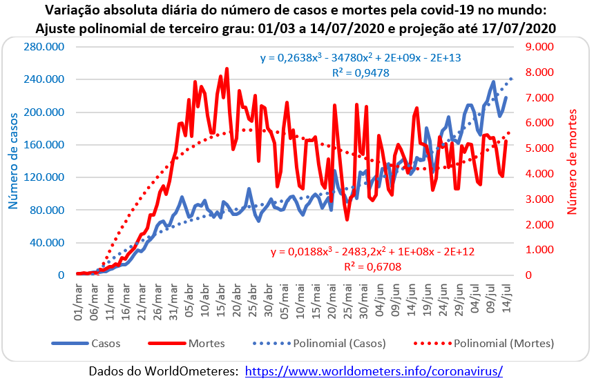 No gráfico abaixo, a curva do número de casos parecia que iria se inverter em meados de maio e começar a decrescer, porém, manteve a tendência de alta e acelerou a subida. Nos primeiros 14 dias de julho, o número médio de pessoas infectadas ficou em 207 mil novos casos, acrescentando mais de 1 milhão de casos a cada 5 dias. A curva de mortes, que atingiu um pico de cerca de 8 mil óbitos diários no início de abril, iniciou uma tendência de baixa até aproximadamente 4 mil óbitos diários no final de maio, mas inverteu a tendência e subiu para algo em torno de 5 mil óbitos diários atualmente.