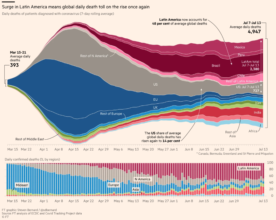 A Europa e os EUA respondiam por apenas 6% das mortes diárias em 29 de fevereiro, mas deram um salto para cerca de 80% em meados de março e para 90% na primeira quinzena de abril. Mas ambos passaram a ter uma menor participação nos meses seguintes e na semana de 23 a 29 de junho a Europa respondia por 10%, os EUA por 12% e a América Latina e Caribe (ALC) por 52% das mortes diárias. Na América Latina os destaques são: Brasil, México, Peru e Chile.