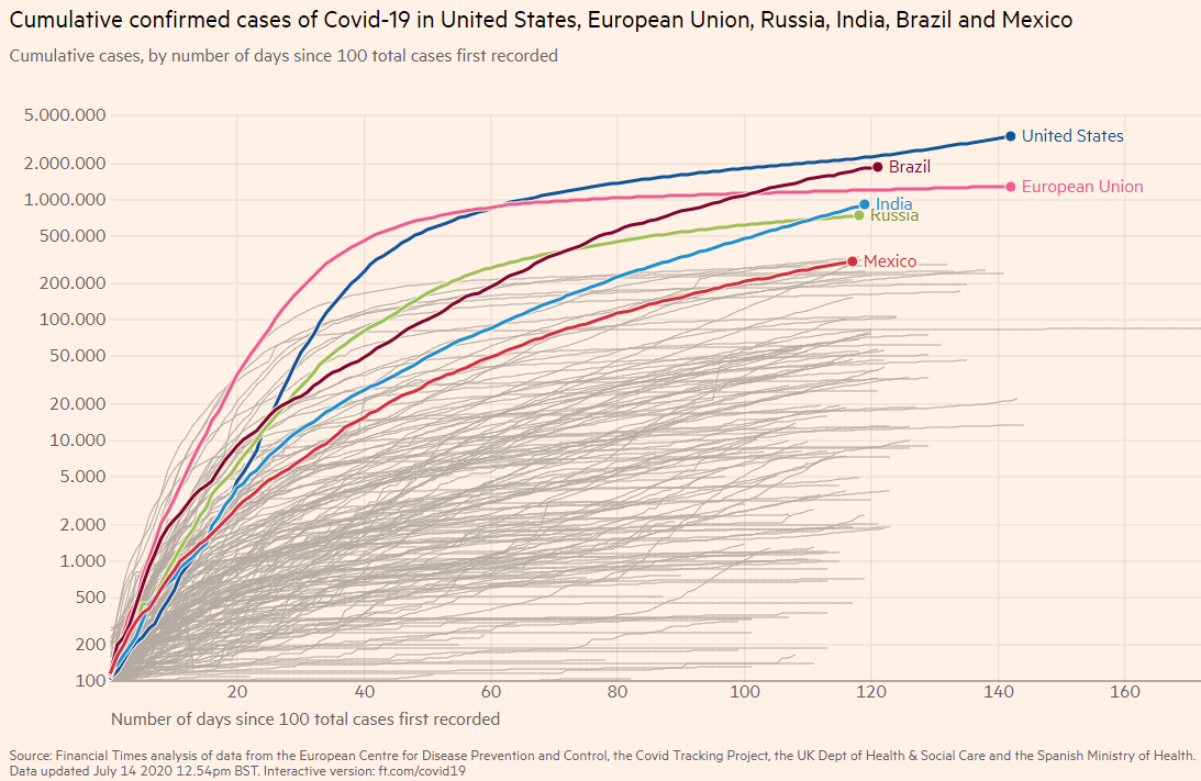 O gráfico abaixo, também do Financial Times (em escala logarítmica), mostra que os EUA lideram o número acumulado de casos, seguido pelo Brasil – que está à frente da soma de todos os países da União Europeia. A Índia já ultrapassou a Rússia e o México está a ponto de ultrapassar o Peru e o Chile. Atualmente, o Brasil está em segundo lugar tanto no número de casos acumulados, quanto no número de casos diários.