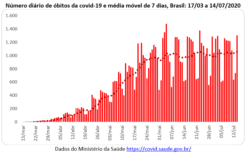 No dia 04 de junho se atingiu a maior variação diária com 1.473 óbitos, sendo que a média móvel ficou 1.038 óbitos. Desde então, o número tem ficado sistematicamente acima de 1.000 mortes diárias. No dia 23 de junho a variação diária ficou em 1.374 óbitos, com a média móvel de 7 dias ficando em 1.058 óbitos. E ontem, dia 14/07, a variação diária ficou em 1.300 óbitos, com uma média móvel de 1.056 óbitos. Portanto, o Brasil tem mantido um número médio de vítimas fatais acima de 1.000 óbitos desde o final do mês de maio. Um pico que não passa.