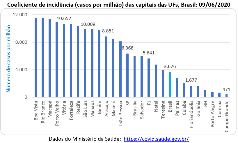 Mas o Rio não se destaca somente no cenário internacional, pois tem também uma posição proeminente entre as capitais do país. O gráfico abaixo mostra o coeficiente de incidência para todas as capitais estaduais e para o total nacional, no dia 09 de junho. O Brasil apresentou um coeficiente de 3,7 mil casos por milhão de habitantes e a capital fluminense um coeficiente de 5,6 mil casos por milhão. Na dianteira está Boa Vista (capital de Roraima), com quase 12 mil casos por milhão e na outra ponta, com o menor coeficiente está Campo Grande (capital de Mato Grosso do Sul) com 471 casos por milhão.