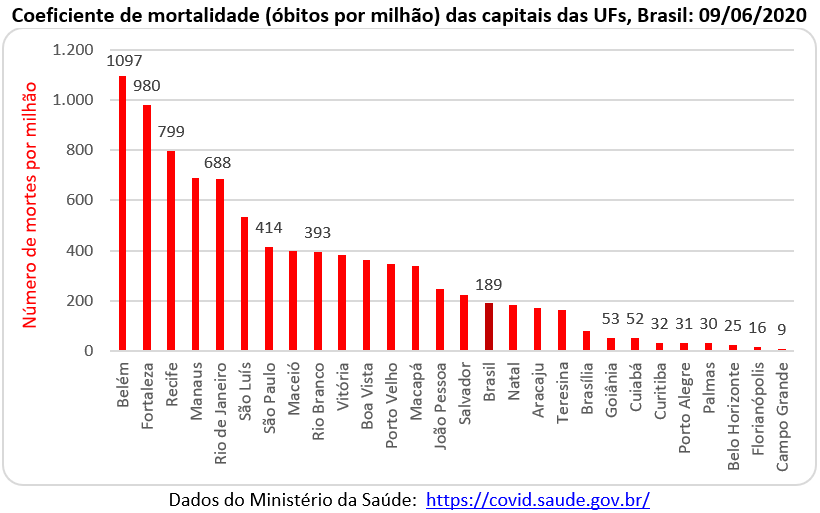 Mas a posição da cidade do Rio Janeiro é ainda mais difícil quando se considera o número de vidas perdidas. O gráfico abaixo mostra o coeficiente de mortalidade para todas as capitais estaduais e para o total nacional, no dia 09 de junho. O Brasil apresentou um coeficiente de 189 óbitos por milhão de habitantes e a capital fluminense um coeficiente de 688 óbitos por milhão. Na dianteira está Belém (capital do Pará), com 1.097 óbitos por milhão e na outra ponta, com o menor coeficiente está também Campo Grande com apenas 9 óbitos por milhão. Campo Grande tem um coeficiente de mortalidade 123 vezes menor do que Belém e 110 vezes menor do que Fortaleza. Isto mostra que existem capitais que estão conseguindo evitar uma grande mortandade da covid-19.