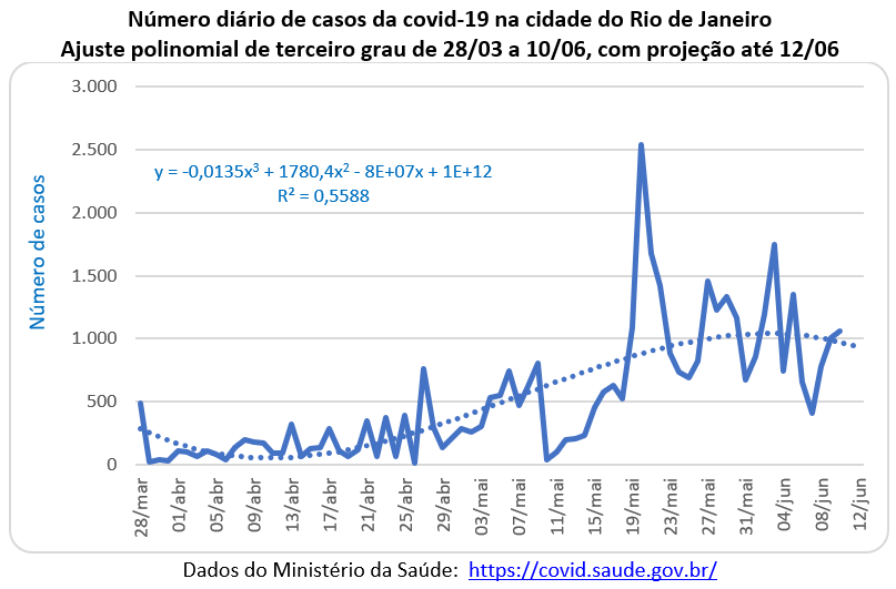 O número de pessoas infectadas ficou, em média, abaixo dos 500 casos diários até meados de maio, quando deu um salto para 2.535 no dia 20 de maio e depois oscilou em torno de mil novos casos diários. Com os dados mais recentes (muito influenciados pelo fim de semana), a curva do ajuste polinomial de terceiro grau aponta para uma estabilização e até uma ligeira redução dos casos.