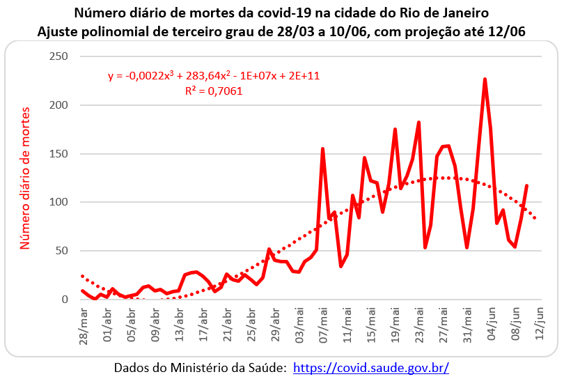 Depois de um certo tempo após o crescimento do número de casos, começou o crescimento do número de mortes. No mês de abril, o número de vidas perdidas para o novo coronavírus ficou abaixo de 50 óbitos diários. Mas no mês de maio este número ficou acima de 100 óbitos diários e atingiu o valor máximo de 227 óbitos no dia 03 de junho. Também com os dados atuais (muito influenciados pelo fim de semana), a curva do ajuste polinomial de terceiro grau aponta para uma redução no número de mortes. Mas não existe certeza ainda se esta redução é conjuntural ou estrutural.
