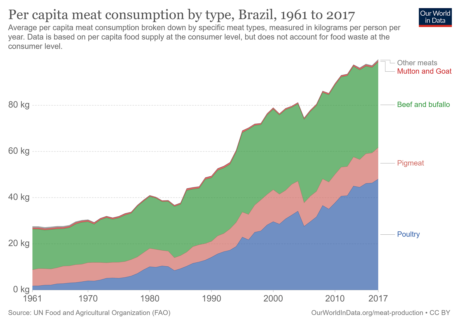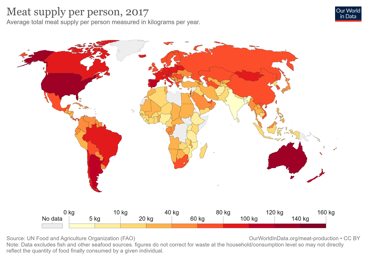 Nos últimos 60 anos a produção subiu quase cinco vezes, passando de 70 milhões de toneladas em 1960 para mais de 330 milhões em 2017. É verdade que há muito mais gente no mundo. No início da década de 1960, havia cerca de 3 bilhões habitantes no planeta. Hoje, somos mais de 7,6 bilhões. Sozinho, no entanto, esse argumento não explica como a produção de carne se multiplicou por cinco. A resposta está no aumento da renda. A média global mais do que triplicou em meio século. Uma olhada rápida no mapa do consumo per capita revela que quanto mais rica é uma nação maior tende a ser o número de carnívoros. Logo, não é só uma questão de ter mais gente no mundo. São mais pessoas, mais pessoas que podem comprar e mais pessoas que querem comprar carne.