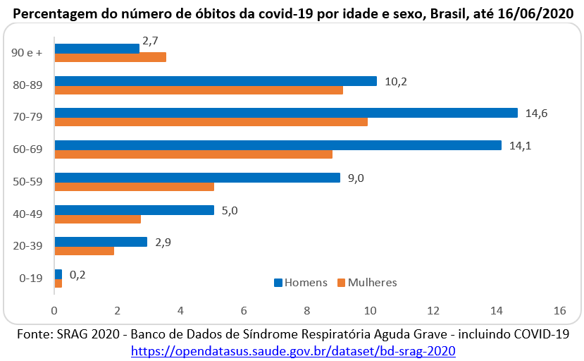 Segundo os dados registrados até 16/06/2020, do conjunto dos óbitos confirmados por covid-19 no Brasil, entre os que foram hospitalizados (41.580), em termos de gênero, 41,2% eram mulheres e 58,8% eram homens. Em termos de geração, 27,1% tinham menos de 60 anos e 72,9% eram idosos de 60 anos e mais de idade. Portanto, no Brasil, a covid-19 atinge uma proporção maior de homens e de pessoas não idosas do que a média mundial.