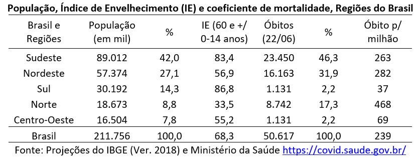 Veja o que já enviamosContudo, a tabela abaixo mostra que a região Norte, que possui o menor Índice de Envelhecimento, é aquela que apresenta o maior coeficiente de mortalidade. A região Norte tem 8,8% da população brasileira e responde por 17,3% das mortes pela covid-19, tendo 468 óbitos por milhão de habitantes (muito acima da média brasileira de 239 óbitos por milhão). No extremo oposto, a região Sul, a mais envelhecida do país, como IE de 87 idosos para cada 100 jovens de 0 a 14 anos, tem um menor coeficiente de mortalidade com 37 óbitos por milhão (12,5 vezes menos do que a região Norte).
