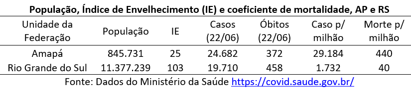 Mas como mostra a tabela abaixo, no dia 22 de junho, enquanto o Amapá tinha coeficiente de incidência de 29.184 casos por milhão e coeficiente de mortalidade de 440 óbitos por milhão de habitantes, os coeficientes do Rio Grande do Sul são, respectivamente 1.732 casos por milhão e 40 óbitos por milhão. Portanto, a Unidade da Federação mais atingida pela covid-19 foi a mais rejuvenescida e não a mais envelhecida.