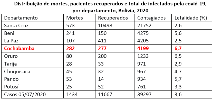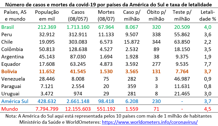 No dia 08 de julho, o Brasil que tem 2,7% da população mundial, tinha 14% dos casos e 12,3% dos óbitos globais. A América do Sul com 5,5% da população mundial, acumula 22% dos casos e 18% dos óbitos. A Bolívia, que tem 0,15% da população mundial, acumula 0,34% dos casos e 0,28% dos óbitos globais, conforme a tabela abaixo.