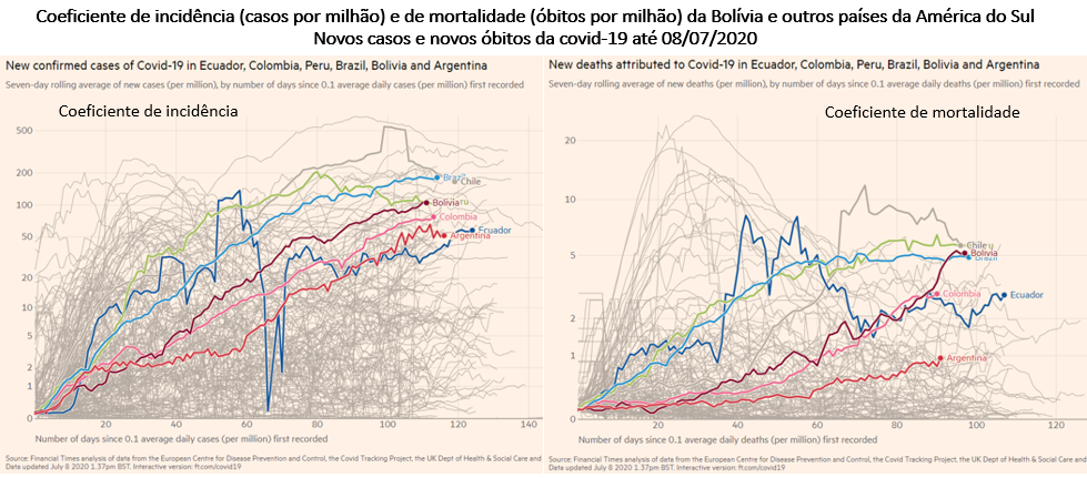 Os gráficos abaixo, com base em material do jornal Financial Times, mostram que não só a Bolívia, mas outros países da América do Sul possuem altos coeficientes de incidência (casos por milhão de habitantes) e de mortalidade (óbitos por milhão de habitantes). As curvas da Bolívia apresentam uma maior inclinação no último mês, mostrando que o número de casos e, especialmente o número de óbitos, tem crescido em ritmo acelerado.