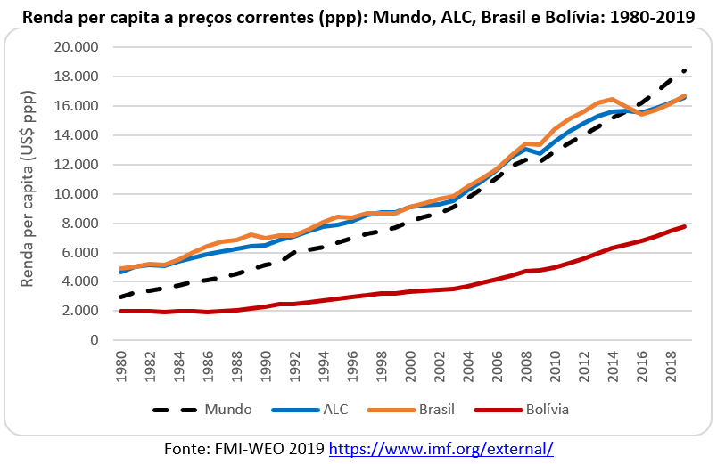 Em 1980, a renda per capita da Bolívia representava dois terços da renda média mundial e menos da metade da renda da ALC. Nos últimos 40 anos a renda da Bolívia se distanciou da renda média mundial e manteve, aproximadamente, a mesma proporção da renda da região (e também do Brasil), conforme mostra o gráfico abaixo, com base nos dados do FMI, a preços correntes, em poder de paridade de compra (ppp na sigla em inglês). Em 2019, a Bolívia tinha uma renda per capita de US$ 7,8 mil, enquanto o Brasil e a ALC tinham renda de cerca de US$ 16,6 mil e a média mundial de US$ 18,4 mil.