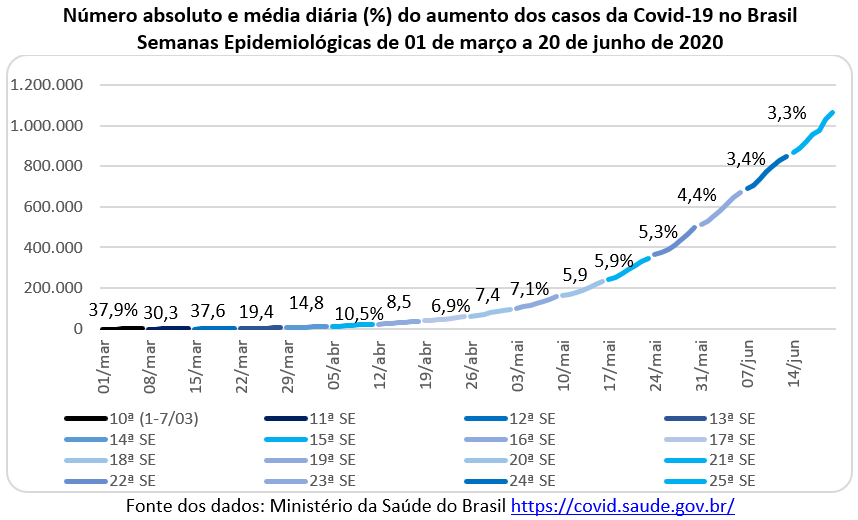 Para avaliar o ritmo da expansão da pandemia no território nacional, o gráfico abaixo mostra a evolução do número de casos da covid-19 por semana epidemiológica (SE), começando pela 10ª SE (de 01 a 07 de março de 2020). No dia 01 de março o Brasil tinha apenas 2 casos confirmados de covid-19 e passou para 19 casos no dia 07/03. Foram apenas 17 casos, mas o aumento foi de 9,5 vezes (o que representa 37,9% ao dia). Até a 13ª SE (22 a 28/03) os números relativos ficaram acima de 30% ao dia. Porém, nas semanas seguintes os números absolutos foram crescendo ao mesmo tempo que a variação percentual foi diminuindo. No mês de março houve acréscimo de 5,7 mil casos, em abril foram 80 mil casos, em maio foram 429 mil casos e, somente nos primeiros 20 dias de junho foram 553 mil casos.