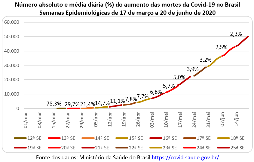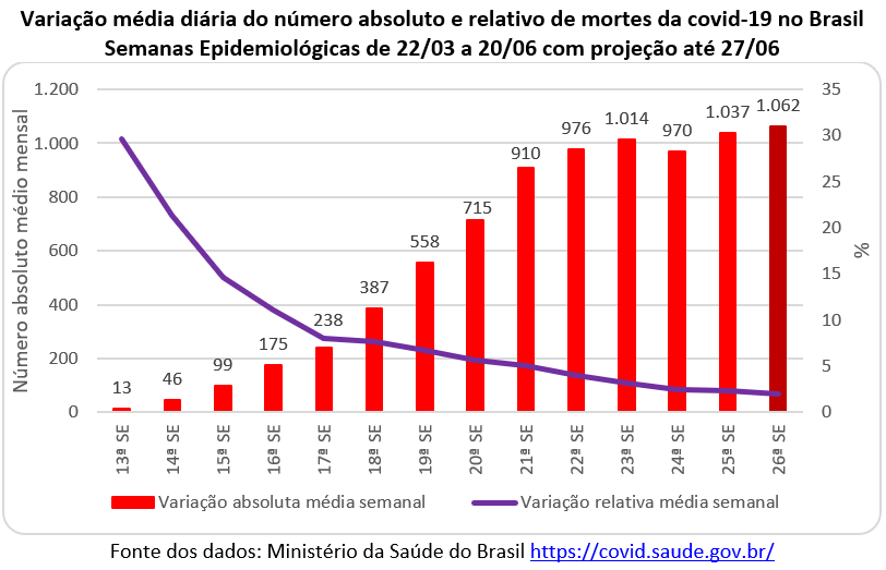 O gráfico abaixo mostra que o aumento absoluto do número de mortes foi muito grande passando de 3.050 óbitos no dia 01/03 para 466 mil no dia 20 de junho. Mas a variação relativa, que chegou ao máximo na 13ª SE (com 13,1% ao dia), diminuiu constantemente nas semanas seguintes até atingir 1% ao dia na 24ª SE. Contudo, na 25ª SE (de 14 a 20/06) houve uma reversão e a percentagem subiu pela primeira vez desde o final de março.