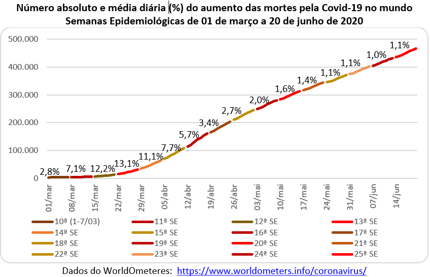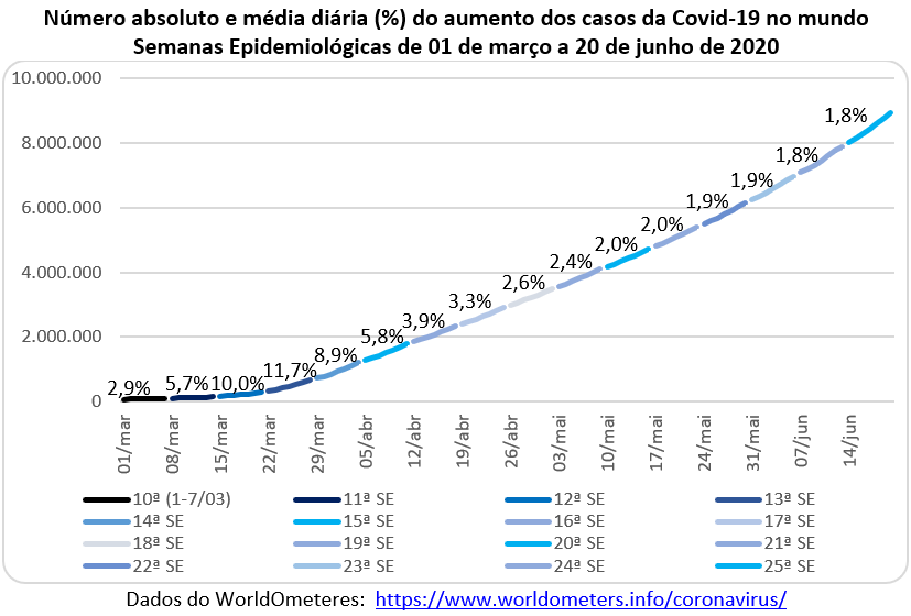 O dia 20 de junho terminou com 8,9 milhões de casos e 466 mil óbitos no mundo, com uma taxa de letalidade de 5,2%. Houve um aumento de 1 milhão de casos em uma semana. Somente no dia 19/06 aconteceram 181 mil novos casos, recorde absoluto de todo o período. O gráfico abaixo mostra as variações absolutas e relativas, sendo que as percentagens estavam caindo rapidamente até a 20ª SE, mas diminuíram o ritmo e variaram apenas de 2,0% para 1,8% até a 25ª SE.