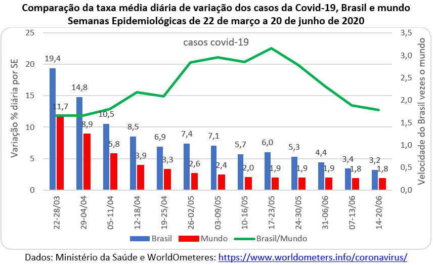 Todos os dados acima mostram que a pandemia recrudesceu na 25ª SE, tanto no Brasil quanto no mundo. O gráfico abaixo mostra que o Brasil estava acelerando em relação ao mundo até a semana de 17 a 23 de maio (21ª SE) e depois passou a desacelerar. O número de casos brasileiros chegou a subir 3 vezes mais rápido do que os casos mundiais, mas na 25ª SE (14-20/06) esta diferença caiu para 1,8 vezes. Ou seja, mesmo menor, o aumento atual do número de casos cresce a um ritmo 80% maior no Brasil do que no mundo.