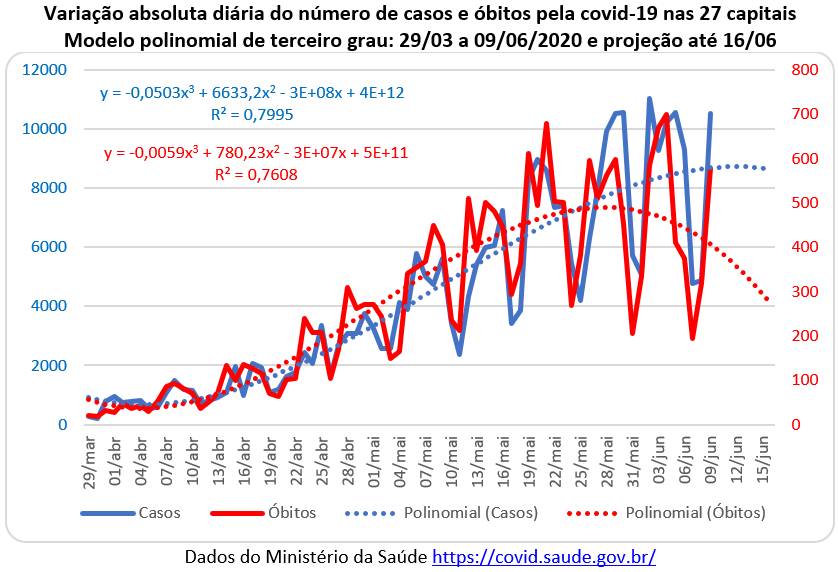 O gráfico abaixo mostra os valores diários das variações dos casos e das mortes da covid-19 para os 5.543 municípios que não são sedes estaduais de 29 março até o dia 09 de junho. Nota-se que todas as baixas acontecem nos fins de semana e as elevações nos dias úteis. Mas as linhas (pontilhadas) do ajuste da tendência polinomial de terceiro grau apresentam uma suavização das oscilações sazonais e indicam uma extrapolação para os próximos 7 dias.