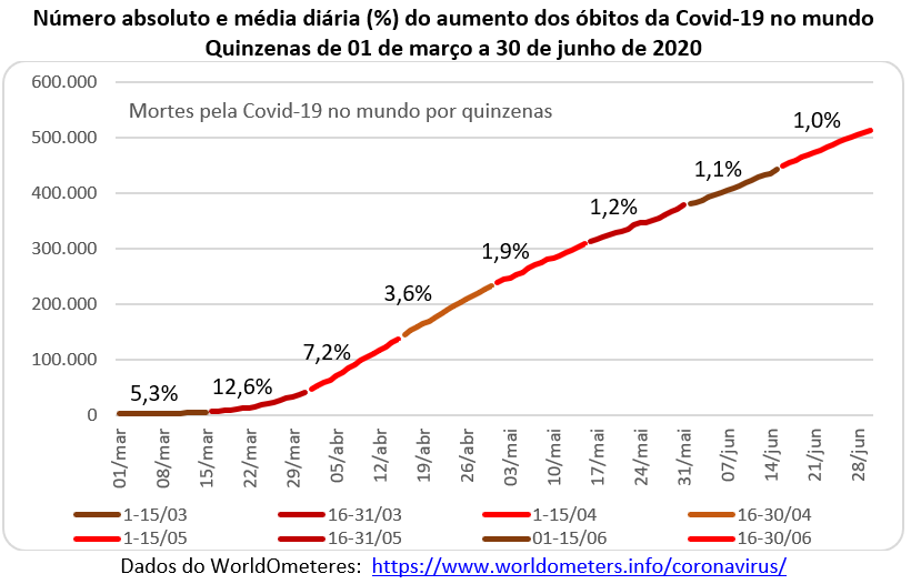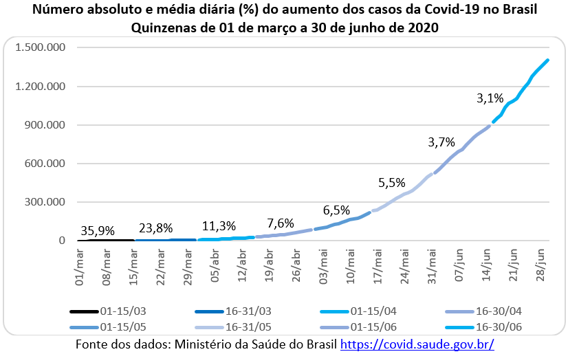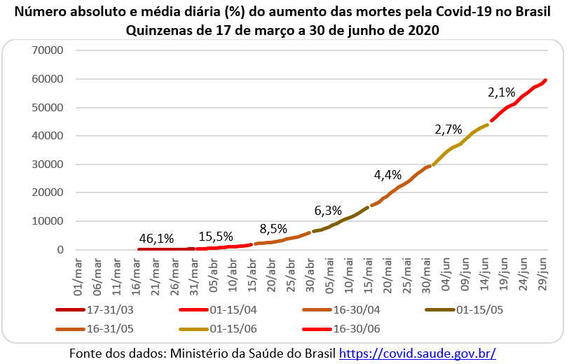 O gráfico abaixo mostra a evolução do número de vidas perdidas nas sucessivas quinzenas, a partir de 17 de março quando houve a primeira morte no Brasil. Na quinzena de 16 a 31 de março aconteceram 201 mortes com um crescimento diário de 46,1% ao dia. Na primeira quinzena de abril o aumento absoluto foi de 1.535 mortes (ou 15,5% ao dia). Nas quinzenas seguintes os números absolutos cresceram enquanto os números relativos diminuíram. Na primeira quinzena de junho houve um acréscimo absoluto de 14,6 mil mortes (ou 2,7% ao dia), número pouco acima da quinzena anterior. Mas na segunda quinzena de junho o acréscimo do número de mortes passou para 15,6 mil óbitos, recorde das 7 quinzenas, o que mostra que não se ultrapassou o pico da curva epidemiológica das mortes no país.