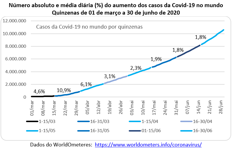 O primeiro semestre de 2020 terminou com o registro oficial de mais de 10 milhões de pessoas infectadas pelo novo coronavírus e mais de 500 mil mortes (fora todas as subnotificações). E o crescimento do número de casos continua aumentando, como mostra o gráfico abaixo. No dia 29 de fevereiro havia 86,6 mil pessoas infectadas (como visto, a grande maioria na China), mas o Sars-CoV-2 se espalhou pelo mundo e passou para 170 mil casos em 15/03, um aumento absoluto de 83 mil pessoas infectadas em 15 dias (um aumento relativo de 4,6% ao dia). O número absoluto continuou aumentando, embora com uma velocidade menor (devido às medidas de isolamento social que reduzem o contágio e a transmissão comunitária).
