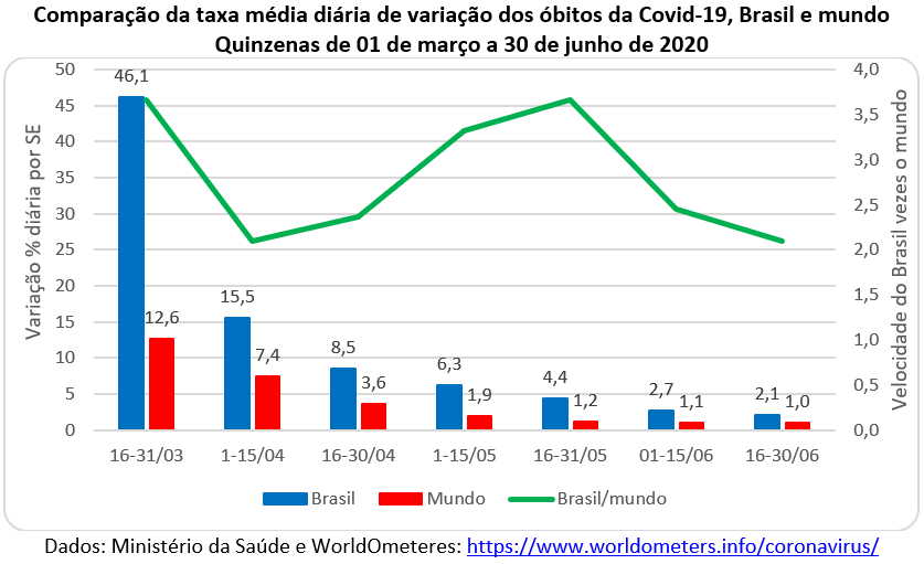 Da mesma forma, o gráfico abaixo apresenta as taxas médias de crescimento diário relativo das vítimas fatais da covid-19 no Brasil e no mundo. Nota-se que a diferença no ritmo de crescimento das mortes diminuiu na 2ª quinzena de março, mas voltou a subir nas quinzenas seguintes e, novamente, caiu na 1ª quinzena de junho. Mesmo assim, o ritmo do aumento das mortes continua 2 vezes mais rápido no Brasil do que na média mundial.