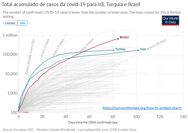 O gráfico abaixo mostra que o Brasil ultrapassou o Irã e a Turquia em número de casos acumulados e continua com uma curva mais vertical, o que indica que a pandemia avança em velocidade maior em território nacional. A Turquia e o Irã estavam horizontalizando a curva, mas o Irã passou a inclinar a curva e passar por uma segunda onda, como veremos melhor mais à frente. No dia 08 de junho, o Brasil registrou 707,4 mil casos, o Irã registrou 173,8 mil e a Turquia 171,1 mil casos. Portanto, o Brasil que estava atrás do Irã e da Turquia até o início de maio, em pouco mais de um mês apresenta valores 4 vezes maiores (o número de casos no Brasil cresceu 6 vezes no mês de maio).
