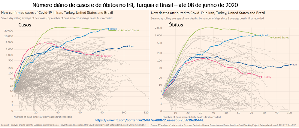 Os gráficos abaixo mostram o número de casos e óbitos diários na Turquia, Irã, Brasil e o Mundo até o dia 08 de junho. Os três países possuem padrões diferentes. Na Turquia, o pico de casos ocorreu no dia 11/04 com 5,1 mil casos, mas este número veio caindo e chegou a 989 casos ontem (08/06) e o número de óbitos chegou ao pico de 127 mortes em 19/04 e caiu para apenas 19 mortes em 08/06.