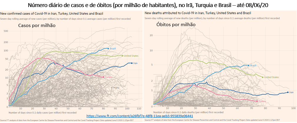 No coeficiente de mortalidade, o Brasil apresenta cerca de 5 óbitos diários por milhão de habitantes, a Turquia cerca de 0,2 por milhão e o Irã 1 óbito por milhão de habitantes, sendo que os iranianos apresentam tendência de alta devido à segunda onda.