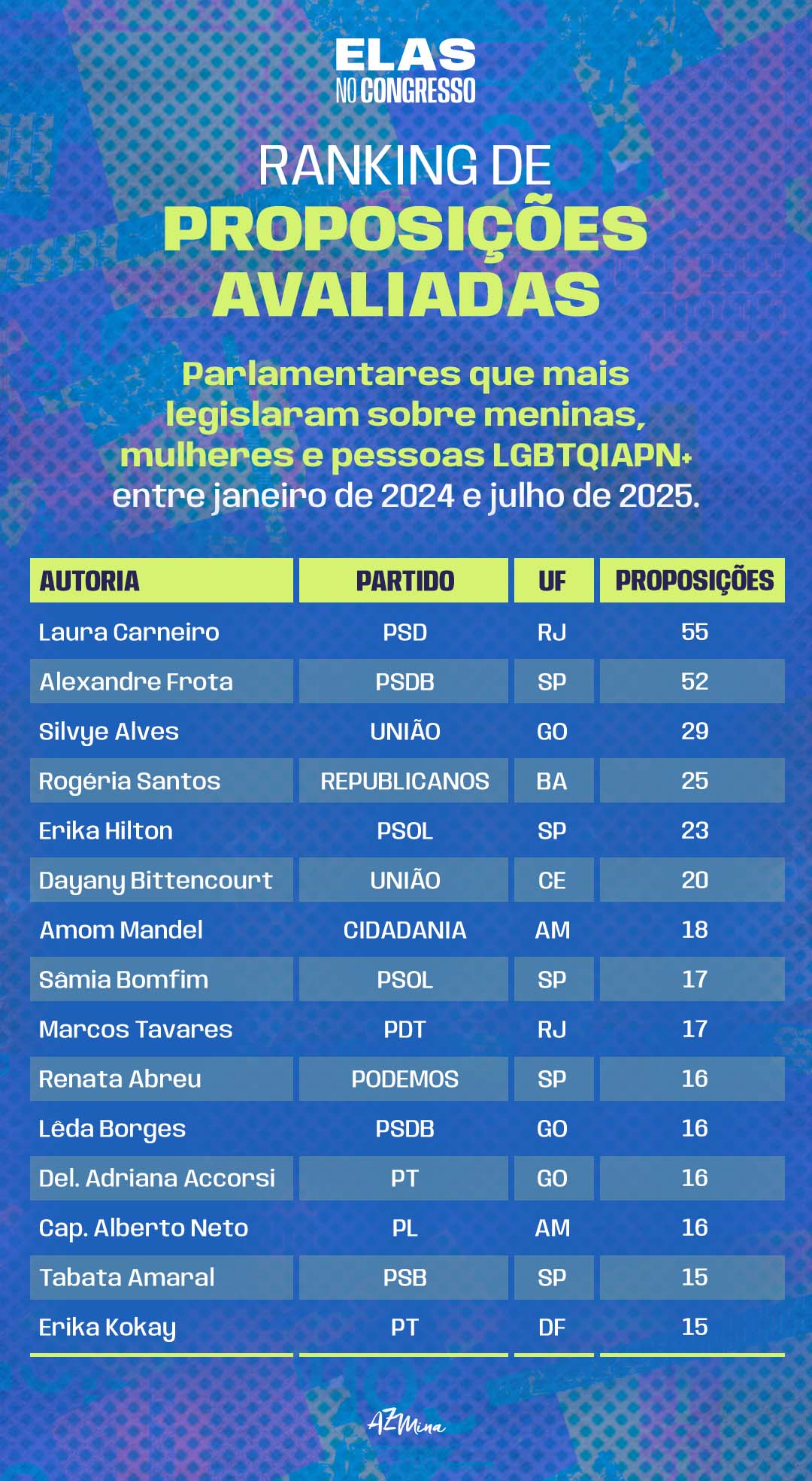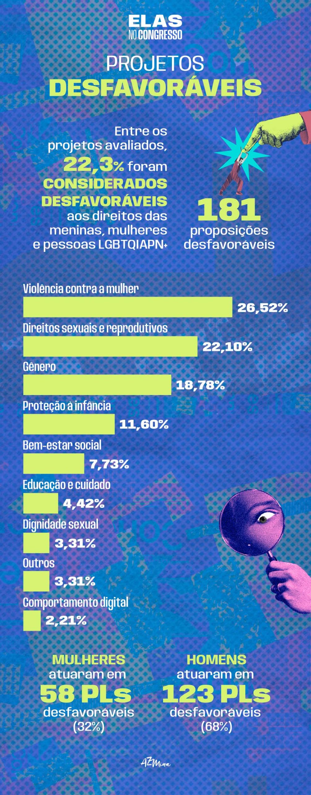 Levantamento identificou que uma em cada quatro proposições entre 812 tinham aspectos prejudiciais à agenda de gênero (Arte: AzMina)